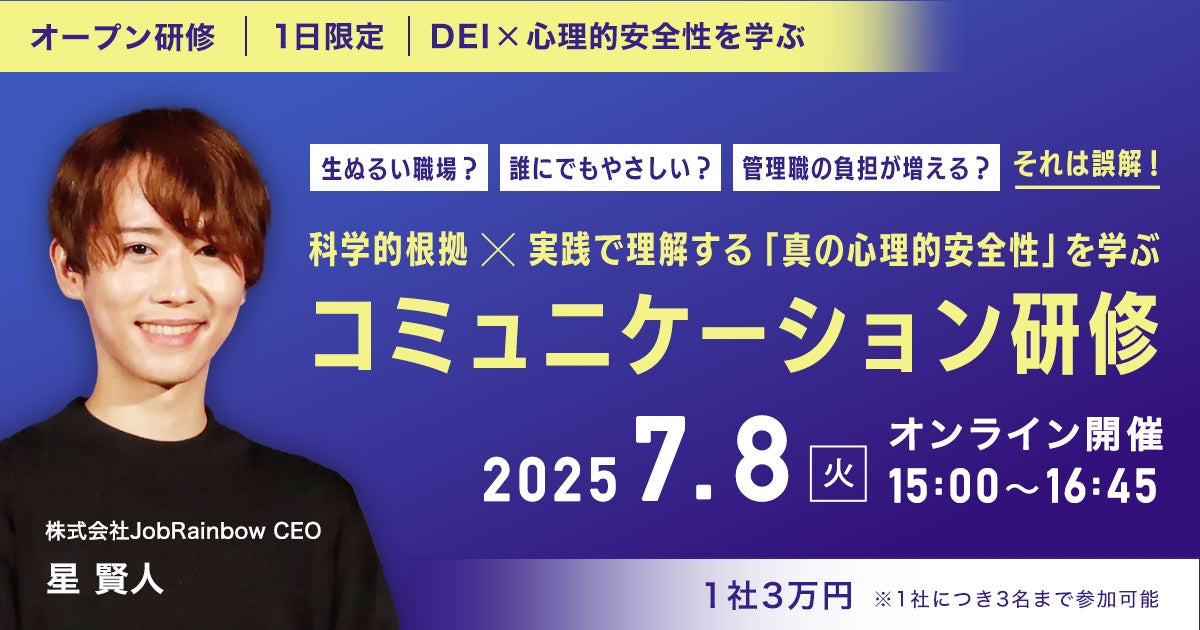 株式会社JobRainbow(本社:東京都千代田区、代表取締役:星賢人)は、2025年7月8日(火)15:00-16:45 オンラインにて、企業のダイバーシティ推進・心理的安全性向上に関するオープン研修