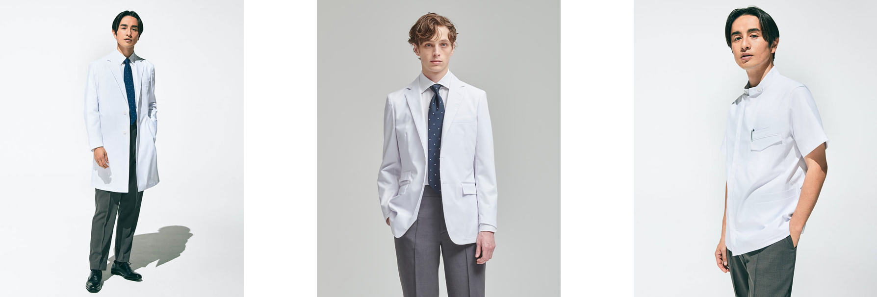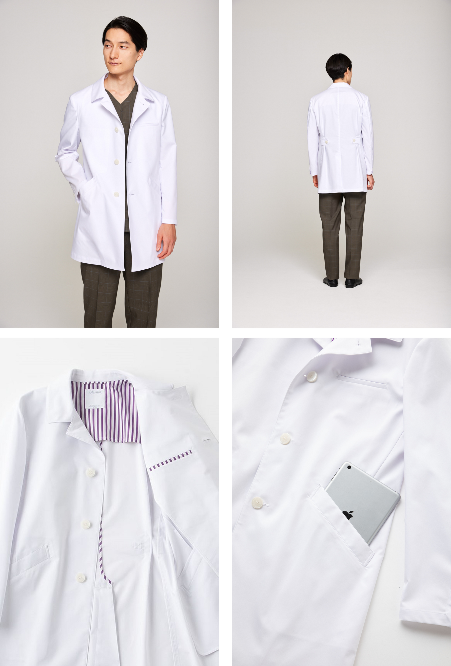 同じ素材を使用した、クラシコの白衣は他に3種類。コートタイプの王道白衣とテーラード技術を駆使したジャケット白衣、ジップタイプのスタイリッシュなケーシーで、どれも幅広い年代に根強い人気を誇ります。