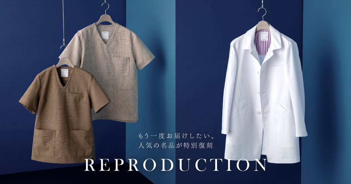 過去に発売し人気を博したスクラブシリーズ「グレンチェック」と白衣「ステンカラーコート」。多くのお客様から支持を集めたシリーズの中から再販希望が多かったアイテムを、この度特別に復刻することになりました。