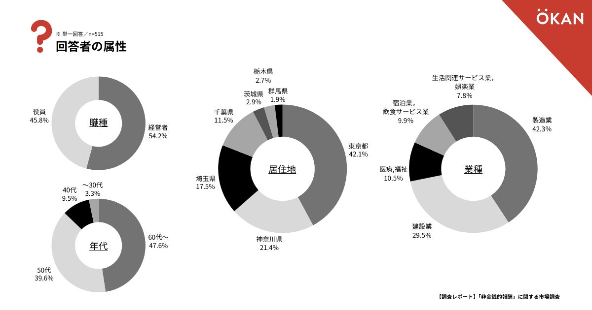 「望まない離職」を生まない組織づくりを支援する株式会社OKAN(本社:東京都豊島区、代表取締役:沢⽊恵太、以下OKAN)は、ノンデスクワーカーやエッセンシャルワーカーが働く企業※の経営に携わる関東地方在住の経営者・役員515名を対象に、「非金銭的報酬」に関する市場調査を行いました。