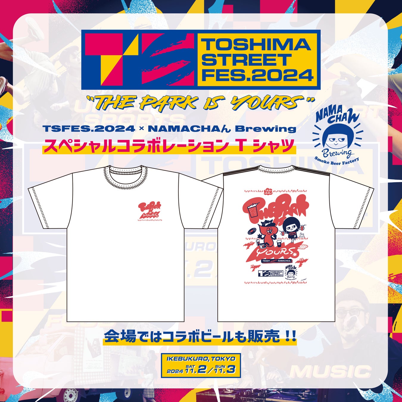 「TOSHIMA STREET FES 2024」の公式キャラクターとして誕生したTEDDYをデザインした限定グッズが登場。今年のテーマ"THE PARK IS YOURS"とTEDDYがプリントされたTシャツやフーディーを含む豊富なアイテムがラインナップされています。
