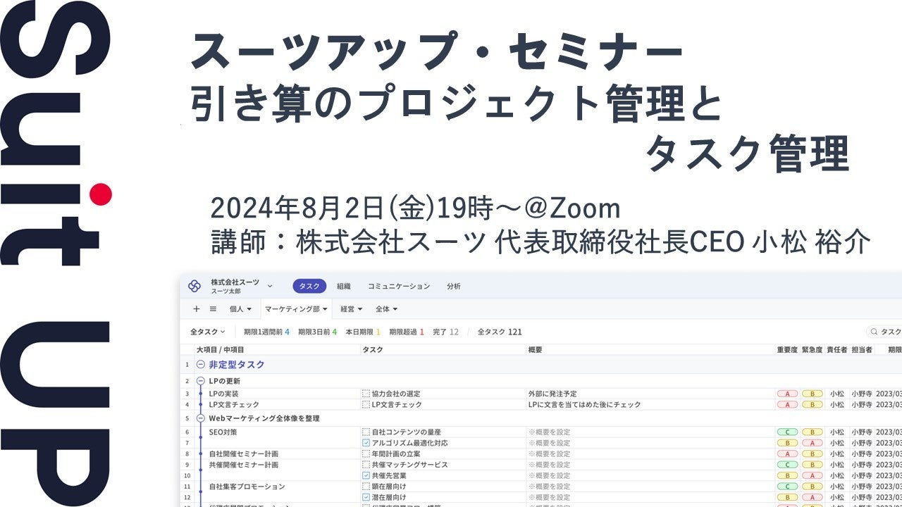 株式会社スーツ(所在地:東京都千代田区、代表取締役社長CEO:小松 裕介)は、2024年8月2日(金)19時から、当社代表の小松が講師を務めるスーツアップ・セミナー「引き算のプロジェクト管理とタスク管理」を無料開催します。