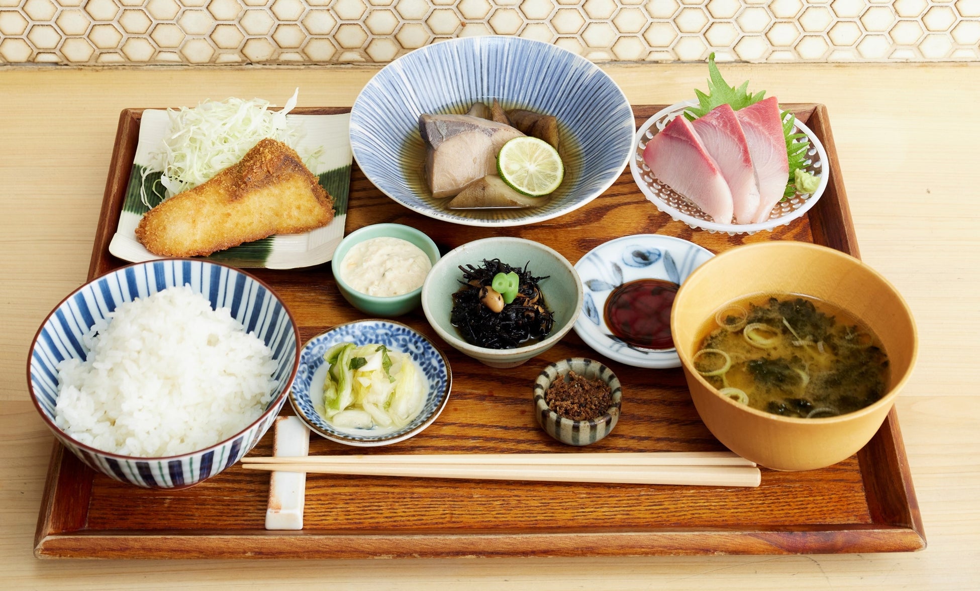 1膳でブリカツ・ブリとごぼうの煮つけ・ブリの刺身と3種類の調理法で黒瀬ぶりが味わえる、「dancyu食堂」オリジナルメニューです。