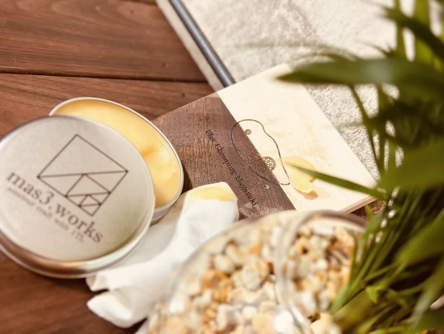 ▼広いドームテントに荷物を置き、さっそく蜜蝋体験へ
