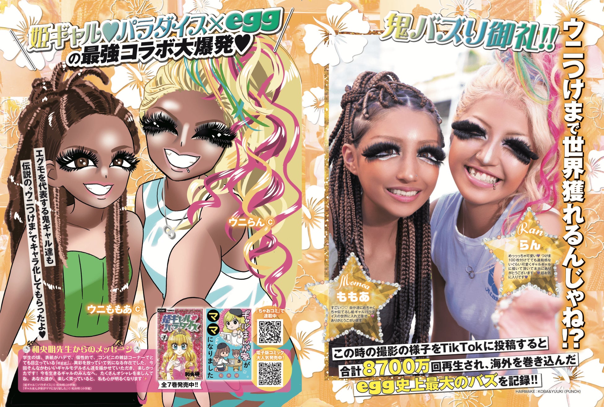 、見た目のインパクトから再生回数合計8,700万回を突破しました。国内だけでなく、国外からも大きな反響を呼び、人気漫画『姫ギャルパラダイス』のウニつけまに似てると多く視聴者からコメントが寄せられ、姫ギャルパラダイス✖️eggのスペシャルコラボも実現しました。