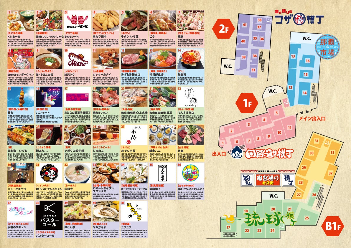 国際通り横丁、那覇市場、琉球横丁、竜宮通り粉もん横丁の4エリアにさらにコザ横丁(2階)が加わり