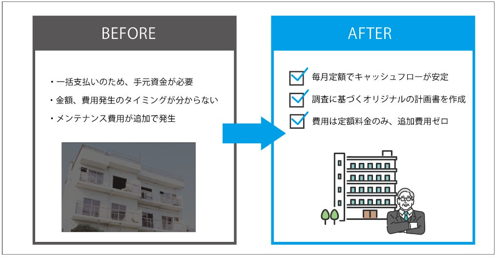 「メンパク」では、毎月定額の支払いのみで、15年間、適切なタイミングで修繕を実施し、追加費用は一切発生しません。借り入れの必要もなく、自主管理大家さんのキャッシュフローが安定するだけでなく、15年間に分割して工事を実施するため、必要な修繕を適切なタイミングで実施することができます。