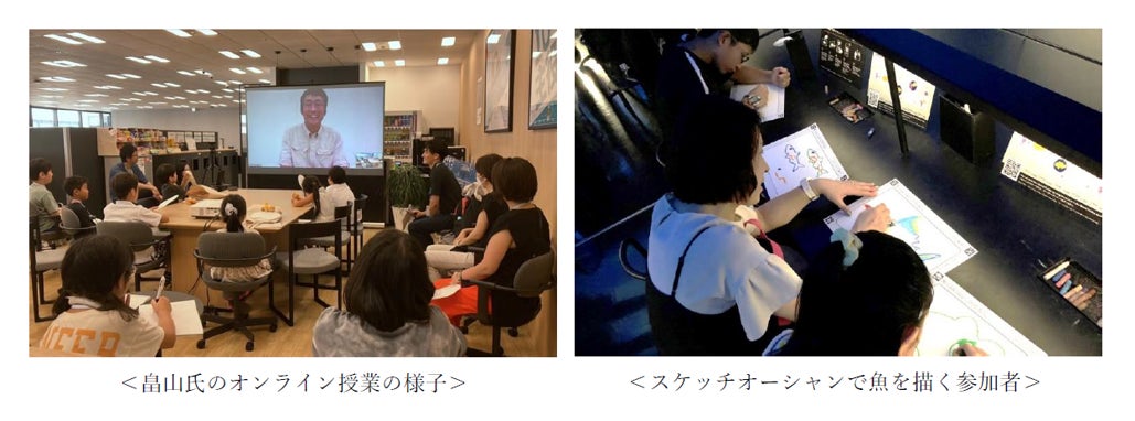 本イベントは2部で構成され、当社オフィスで行われた第一部では、会社紹介の後、NPO法人「森は海の恋人」の副理事長・畠山 信氏による宮城県気仙沼市舞根湾に生息する生き物についてのオンライン講義を行いました。第二部では、チームラボボーダレス内《スケッチオーシャン》で開催中のプロジェクト「Support for Mori-Umi」に参加し、さまざまな魚の絵をスケッチすることで、宮城県気仙沼市舞根湾を拠点とする「森は海の恋人」への寄附を行いました。