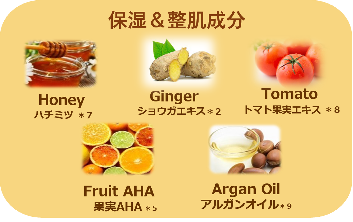 *6 加⽔分解ヒアルロン酸(保湿) *7 保湿 *8トマト果実エキス(保湿)*9 アルガニアスピノサ核油(保湿)