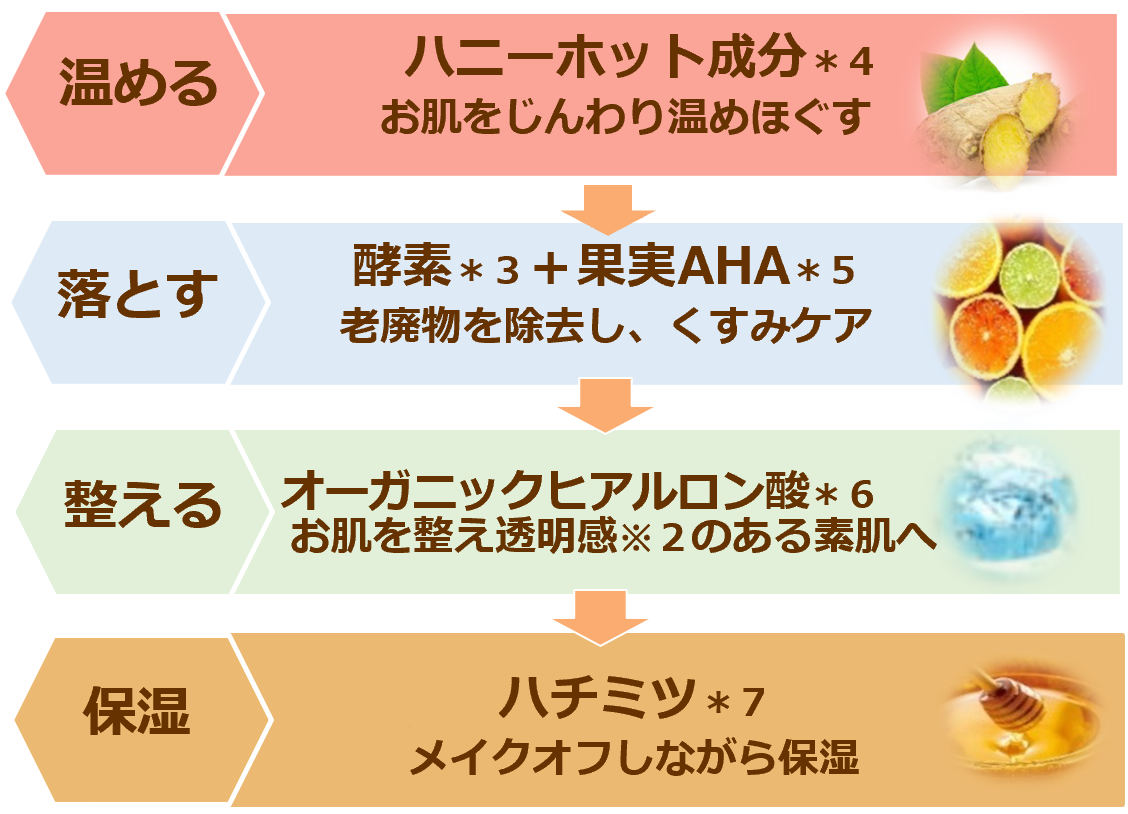 「ハニーホット成分*4」でお肌を温めほぐして「酵素*3」が⽼廃物を除去し、くすみをケア。