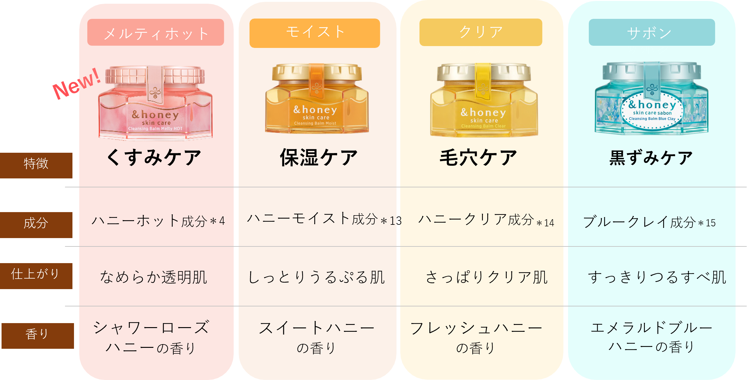 *13 プロポリスエキス、ハチミツ(全て保湿) *14 パパイン(⾓質ケア)、ハチミツ(保湿) *15 イライト(⽑⽳ケア)