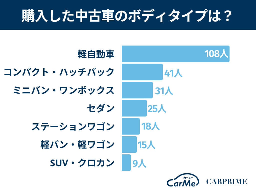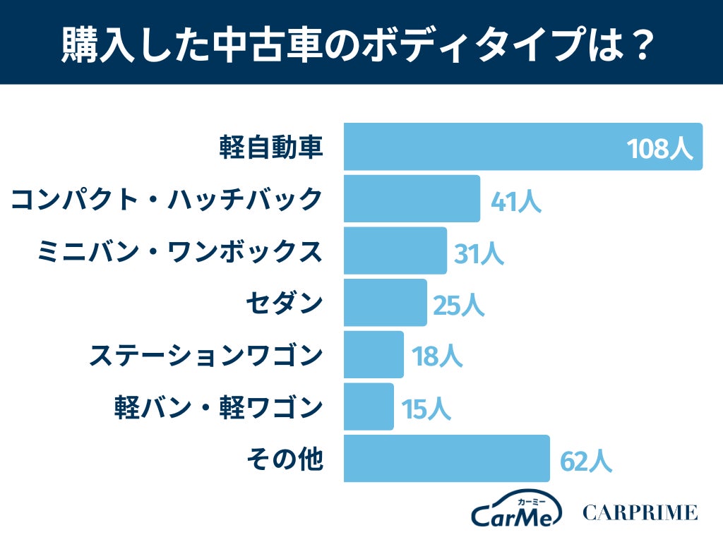 購入した中古車のボディタイプは軽自動車が108名(36%)と圧倒的に人気でした。軽自動車は価格帯が安く、中古車を求めるユーザーにフィットしやすいことが原因と考えられます。