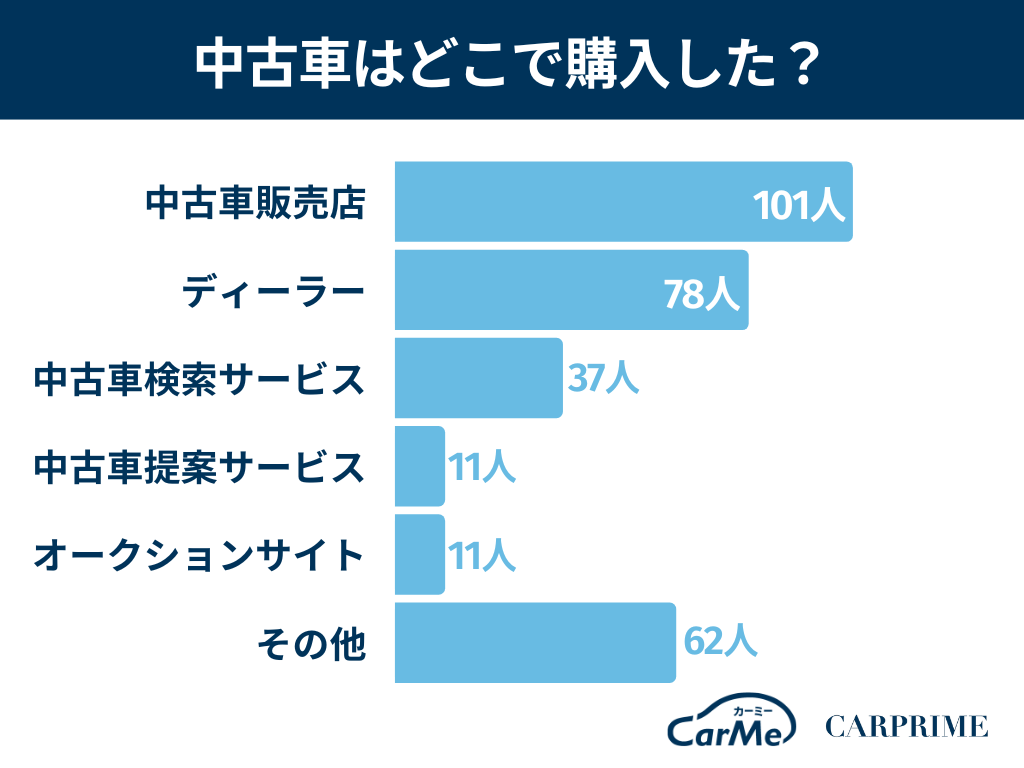 新車ではディーラーが人気なものの、中古車ではディーラーに高い人気があるというわけでもないようです。とはいえ、ディーラーで中古車を購入した方は78名(26%)で中古車販売店に次ぐ多さでした。