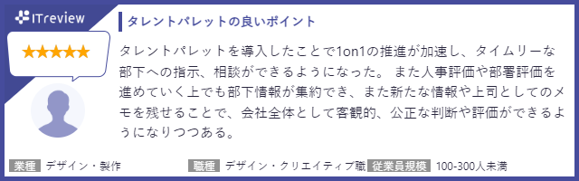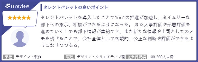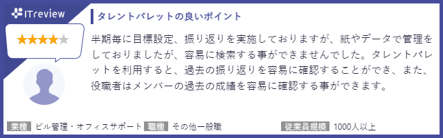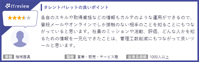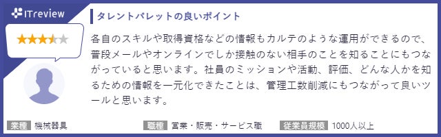 タレントパレットは、5 点満点中3.8点といった高い満足度を獲得いたしました。ご利用いただいている皆様からは以下のようなコメントを頂戴しております。