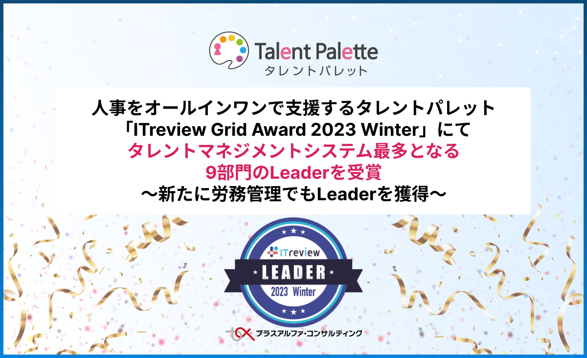 株式会社プラスアルファ・コンサルティング(所在地:東京都港区、代表取締役社長:三室 克哉、証券コード:4071)が提供するタレントマネジメントシステム「Talent Palette(以下:タレントパレット)」が、アイティクラウド株式会社(本社:東京都港区、代表取締役社長:黒野源太)運営のIT製品レビュープラットフォーム「ITreview (アイティレビュー)」において投稿されたレビューをもとに、ユーザーに支持された優れた製品であると評価され、「ITreview Grid Award 2023 Winter」において、タレントマネジメント部門をはじめITreviewに掲載されているタレントマネジメントシステムで最多となる9部門にわたり「Leader」を受賞しましたことをお知らせします。