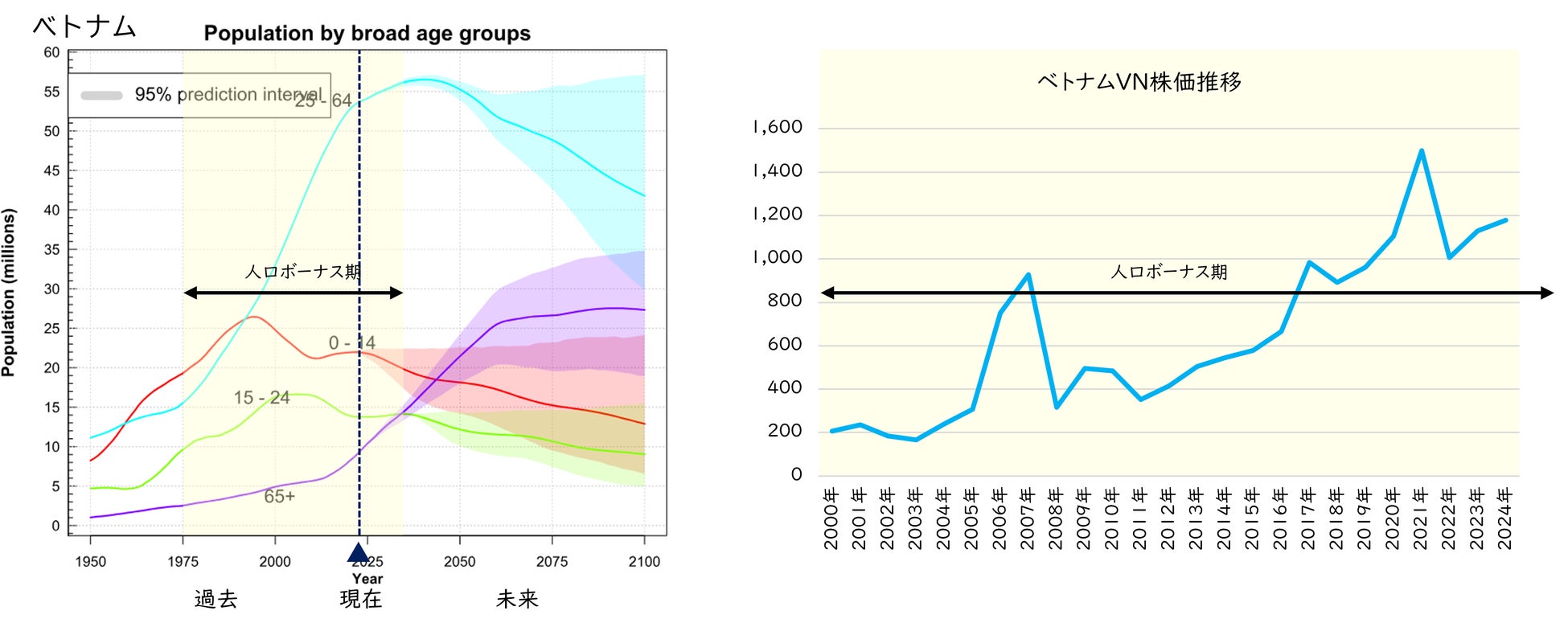次に、各国の人口ボーナス期を見ていきます。ベトナムの人口ボーナス期は1975年~2035年、ベトナムの人口は2023年に1億人を超えました。
