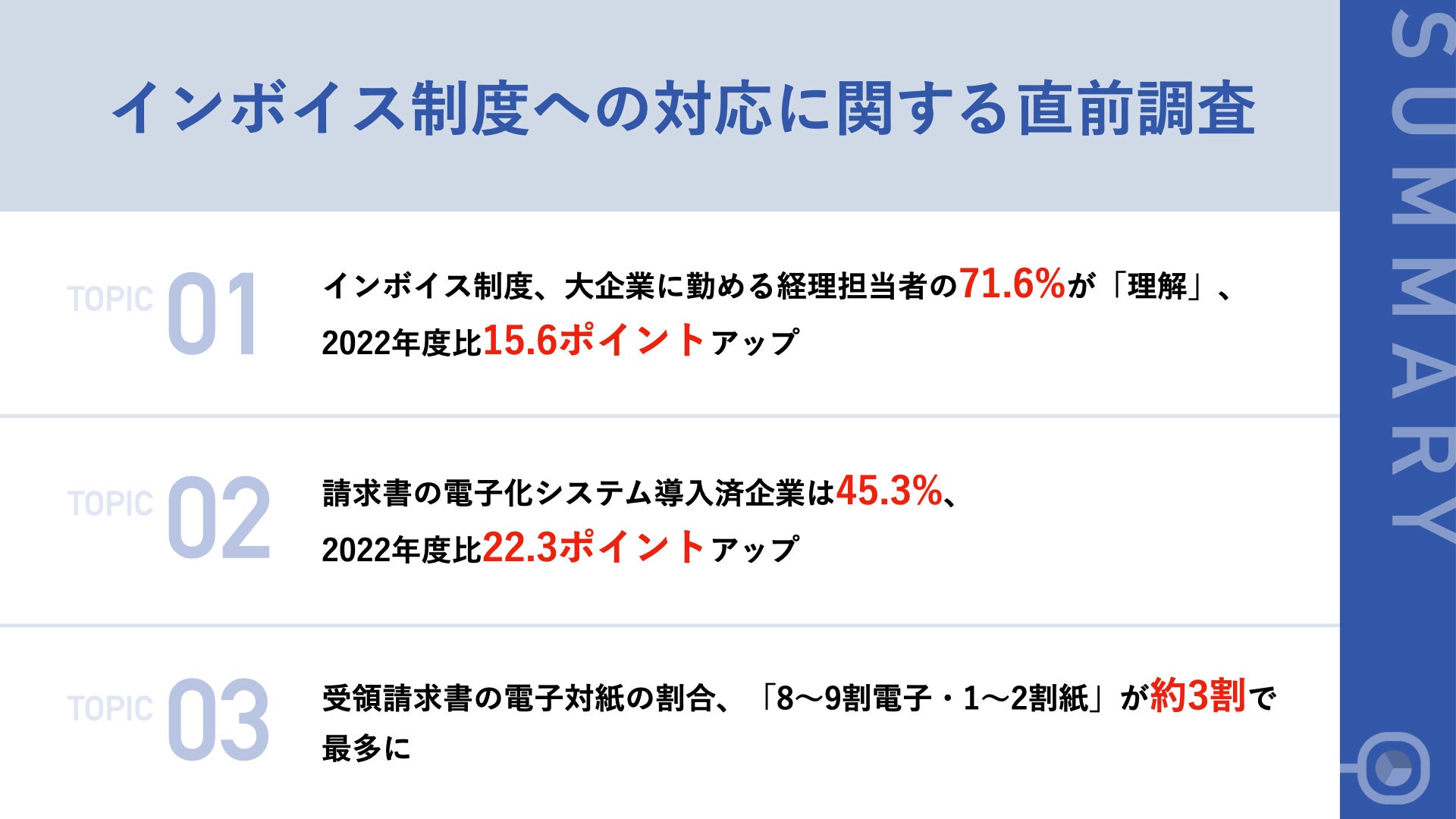 まもなく10月から開始される「インボイス制度」について、71.6%が「理解している」と回答し、2022年度から15.6ポイント上昇したことが分かりました。取引先から受領する請求書の形式としては、「8~9割電子・1~2割紙」が27.4%で最多となっています。また、8割以上の担当者が、取引先に対して「紙の請求書を電子にして欲しい」と回答しており、約半数が「紙の処理の方が社内処理上工数がかかるから」を理由に挙げています。