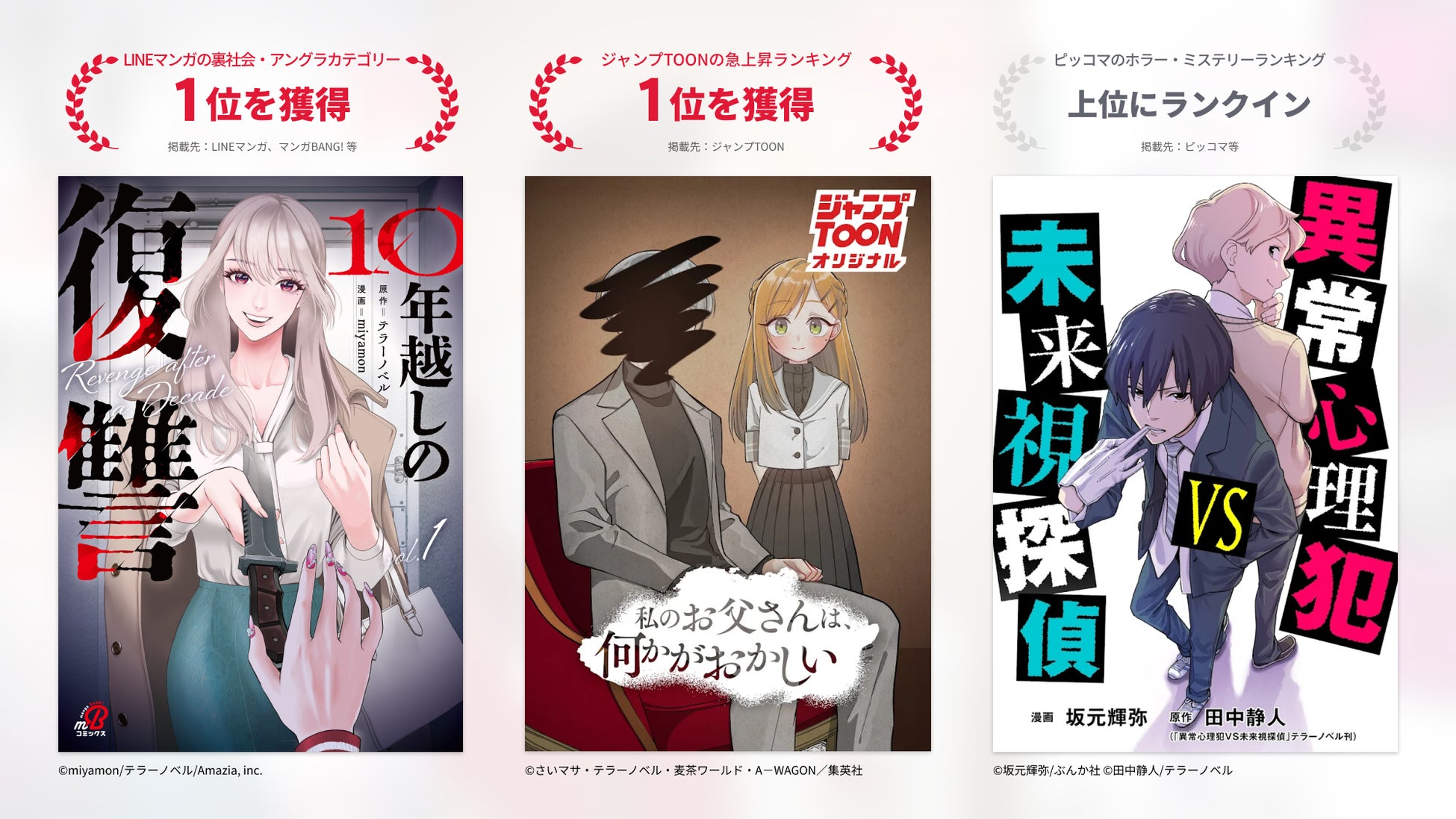 また、コミカライズ作品は制作中のタイトルも含めると100を超えており、『10年越しの復讐』、『異常心理犯 VS 未来視探偵』などの代表作をはじめ、直近では『私のお父さんは、何かがおかしい』、『身代わりで嫁いだ冷酷国王は初恋相手でした』が公開されました。