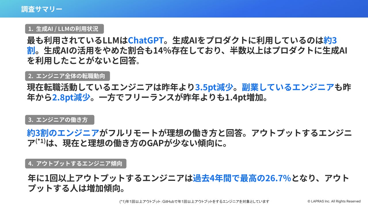 LAPRASでは、2021年から継続的にキャリア調査を実施していますが、2024年はコロナからの回復や生成AI、LLMの広がりを考慮して調査項目を追加しました。アウトプットするエンジニアはコミュニティ貢献や成長意欲が高いという特徴が挙げられます。そのようなアウトプットの習慣があるエンジニアとそうでないエンジニアの比較も本調査で実施しています。