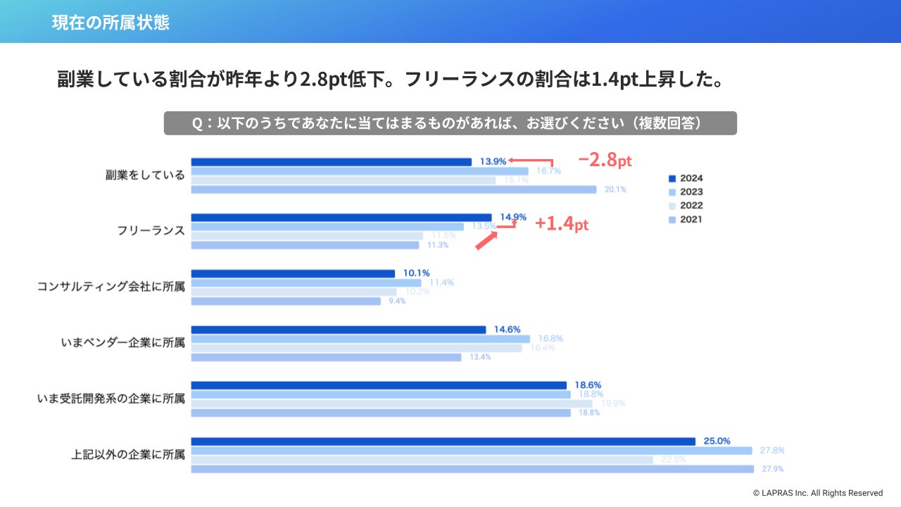現在の所属について聞いた結果、昨年と比べ、副業している割合が減少、フリーランスの割合が増加しました。