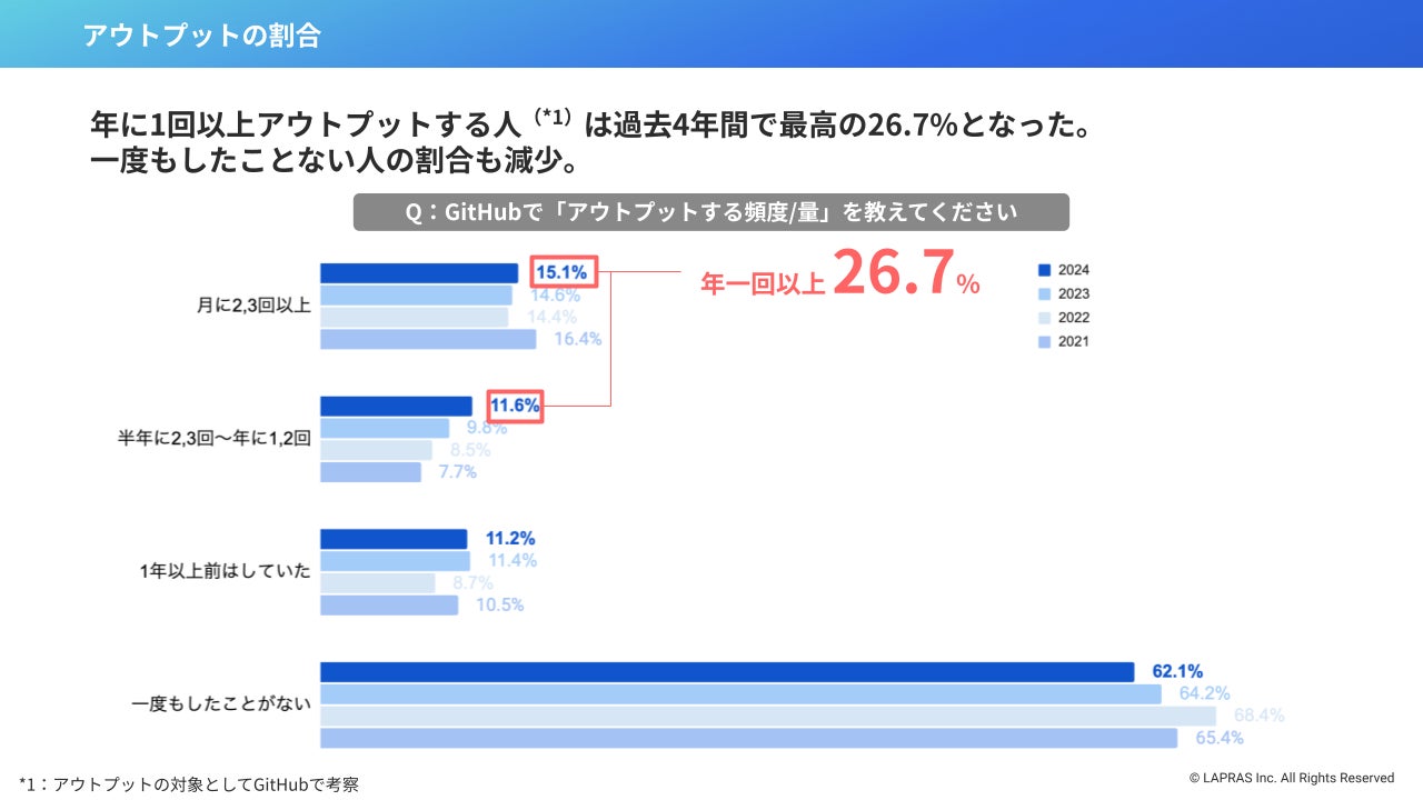 年一回以上アウトプットするエンジニアの割合が過去4年間で最高を更新。学習するエンジニアの増加を反映している結果となりました。