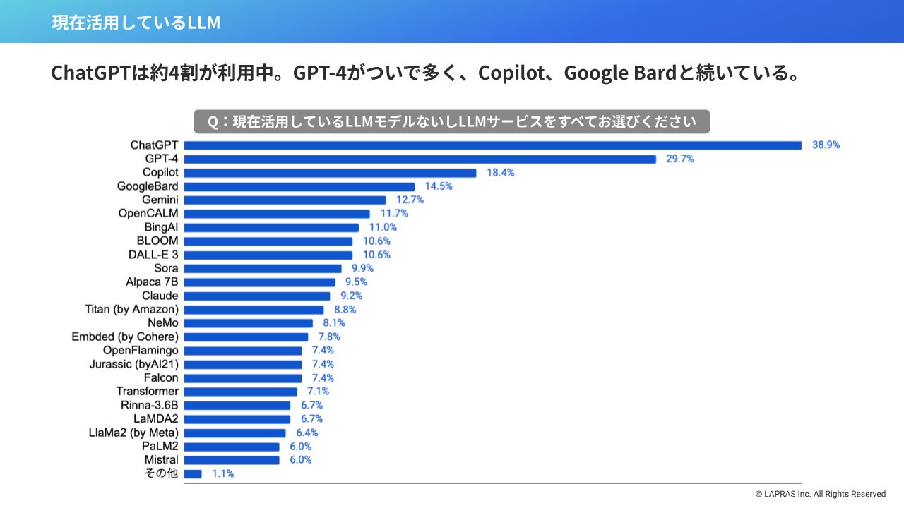 ChatGPTの利用率は4割でトップとなりました。GPT-4がついで多く、Copilot、Google Bardという順序となりました。