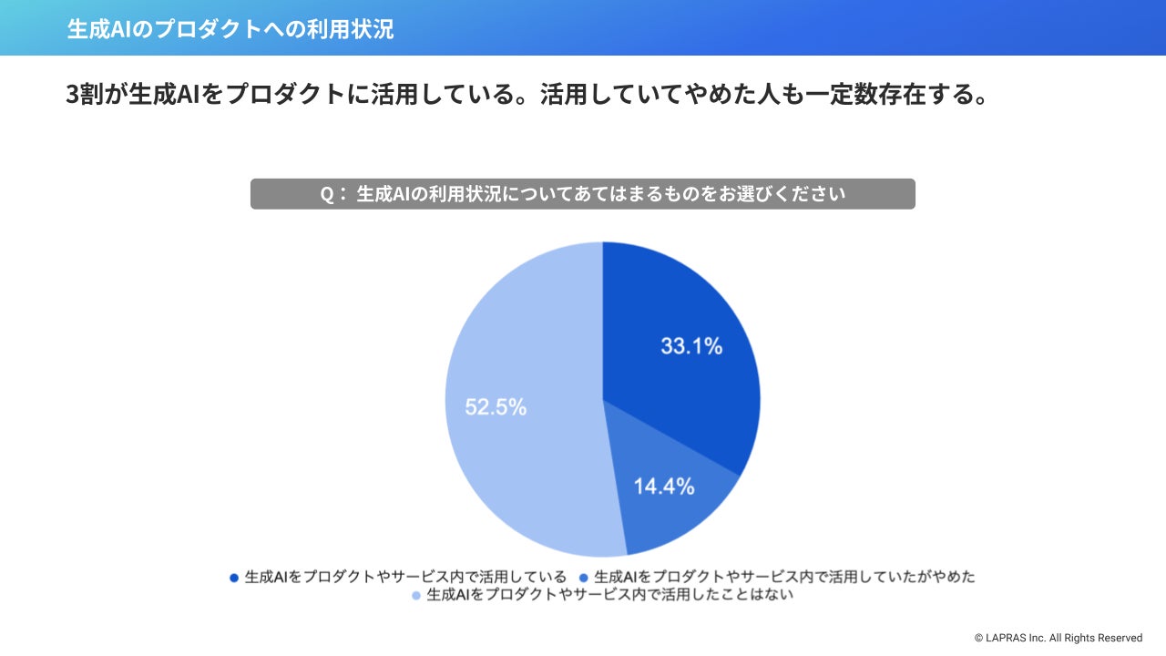 生成AIをプロダクトやサービスに利用しているエンジニアは3割でした。一方で、生成AIの利用をやめた回答が14%ありました。