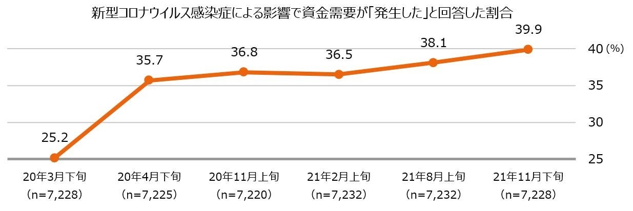中小企業経営者7,228名に、新型コロナウイルス感染症の影響で資金需要は発生したか聞いたところ、資金需要が「発生した」と回答したのは39.9%で、前回調査(8月上旬実施)よりもやや増加(+1.8ポイント)していました。過去におこなった同様の調査と比較すると、2020年3月から4月にかけて大幅に増加し、その後は微増傾向が続いています。