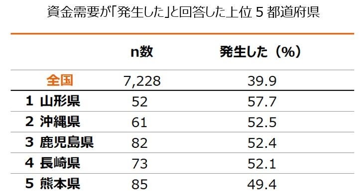 また、資金需要が「発生した」の回答率を都道府県別に見ると、山形県が最も高く(57.7%)、次いで沖縄県(52.5%)、鹿児島県(52.4%)でした。