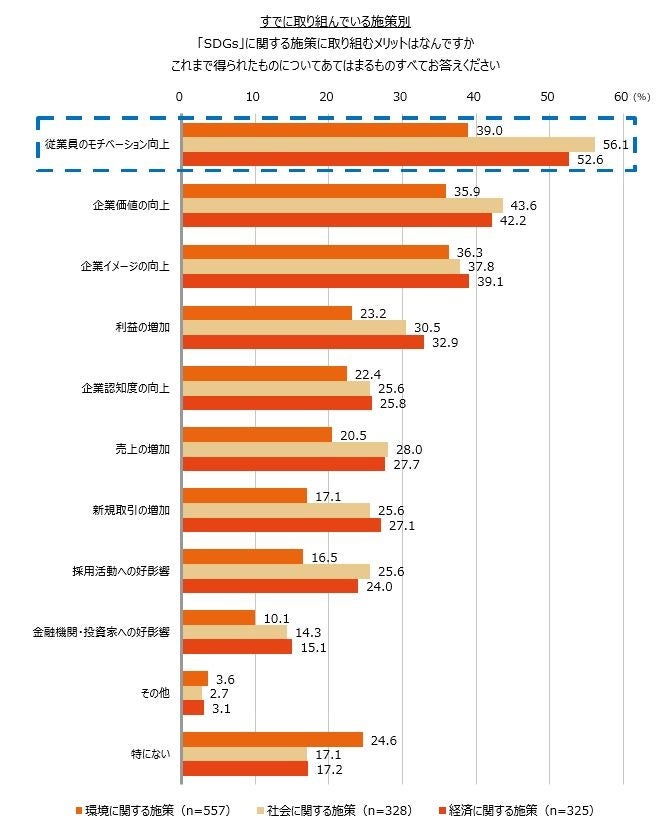 なお、SDGs施策に取り組んで得られたメリットについて、すでに取り組んでいる施策別に見ても、すべての施策で「従業員のモチベーション向上」が最も多い結果となりました。