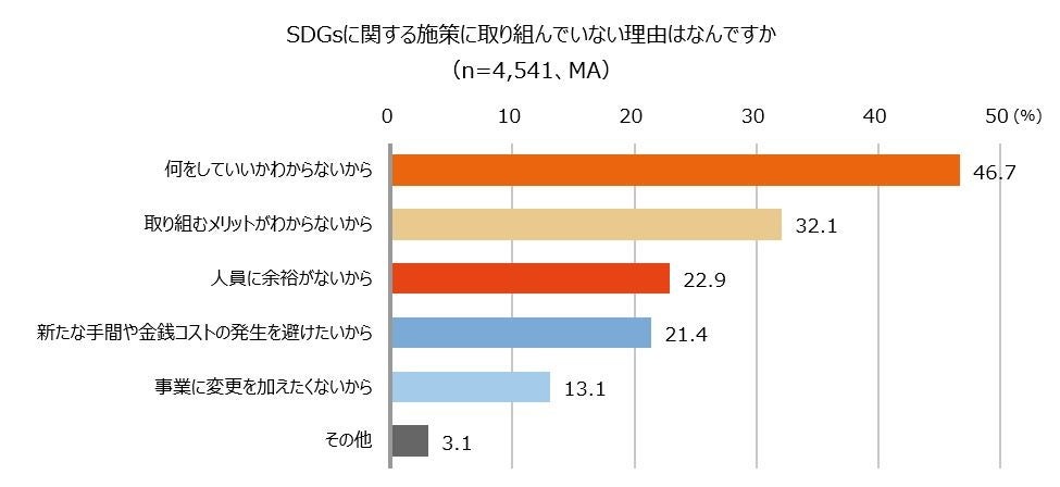 SDGsに関する施策に「取り組んでいない」と回答した4,541名に、取り組んでいない理由について聞いたところ、約半数(46.7%)が「何をしていいかわからないから」と回答し、次いで「取り組むメリットが分からないから」と回答したのが32.1%でした。