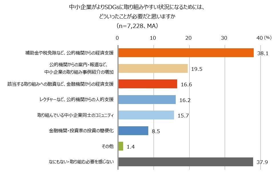 また、中小企業がよりSDGsに取り組みやすい状況になるためにはどういったことが必要だと思うか聞いたところ、「補助金や税免除など、公的機関からの経済支援」が38.1%で最も多く、次いで「公的機関からの案内・報道など、中小企業の取り組み事例紹介の増加」(19.5%)でした。一方で、「なにもない・取り組む必要を感じない」と回答したのは37.9%でした。