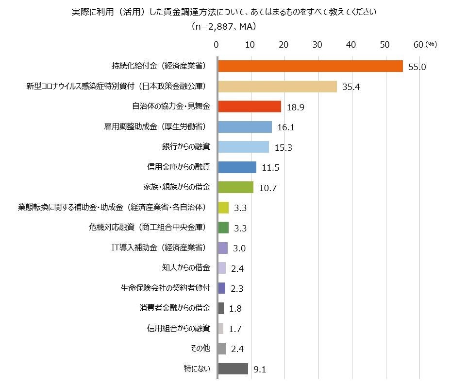 また、資金需要が「発生した」と回答した2,887名に、実際に利用(活用)した資金調達方法について聞いたところ、最も多かったのは「持続化給付金(経済産業省)」(55.0%)で、次いで「新型コロナウイルス感染症特別貸付(日本政策金融公庫)」(35.4%)、「自治体の協力金・見舞金」(18.9%)でした。