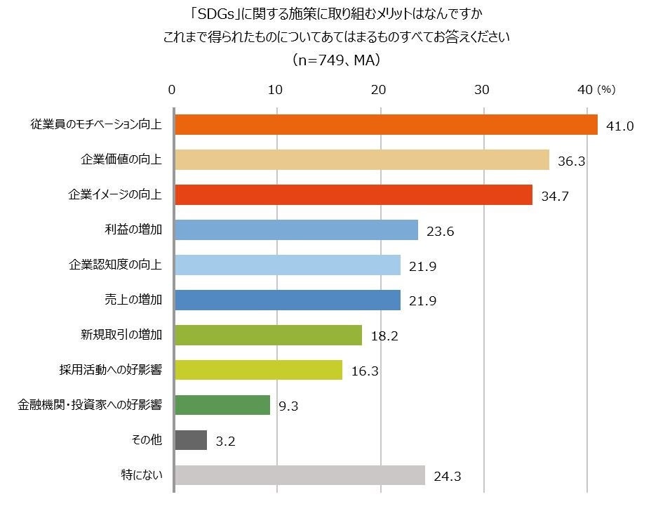 また、すでに施策に取り組んでいると回答した749名に、SDGs施策に取り組んで得られたメリットについて聞いたところ、「従業員のモチベーション向上」が41.0%で最も多い結果となりました。