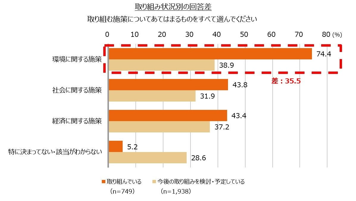 さらに、SDGs施策への取り組み状況別に取り組む施策をみると、すでに施策に取り組んでいる749名の74.4%が「環境に関する施策」と回答し、今後取り組みを検討・予定している1,938名の回答率(38.9%)と比べて35.5ポイントも回答率が高い結果となりました。