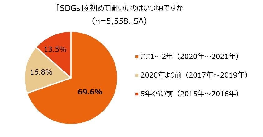 さらに、SDGsを「知っている」「聞いたことがある(内容は知らない)」と回答した5,558名に、SDGsを初めて聞いたのはいつ頃か聞いたところ、「ここ1~2年(2020年~2021年)」が69.6%で最も多い結果となりました。