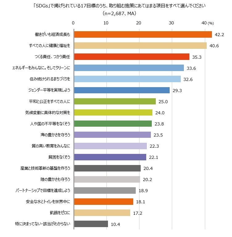 また、SDGsで掲げられている17の目標のうち、取り組む施策にあてはまる目標を聞いたところ、「働きがいも経済成長も」(42.2%)、「すべての人に健康と福祉を」(40.6%)が4割を超えました。