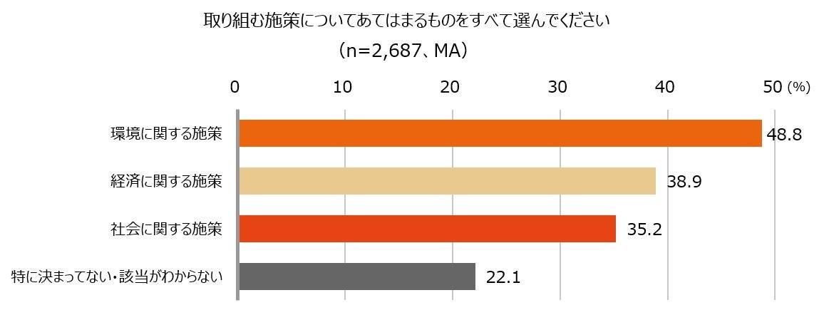 SDGsに関する施策に「取り組んでいる」「取り組んでいないが、今後の取り組みを検討・予定している」と回答した2,687名に、取り組む施策について聞いたところ、約半数(48.8%)が「環境に関する施策」と回答しました。