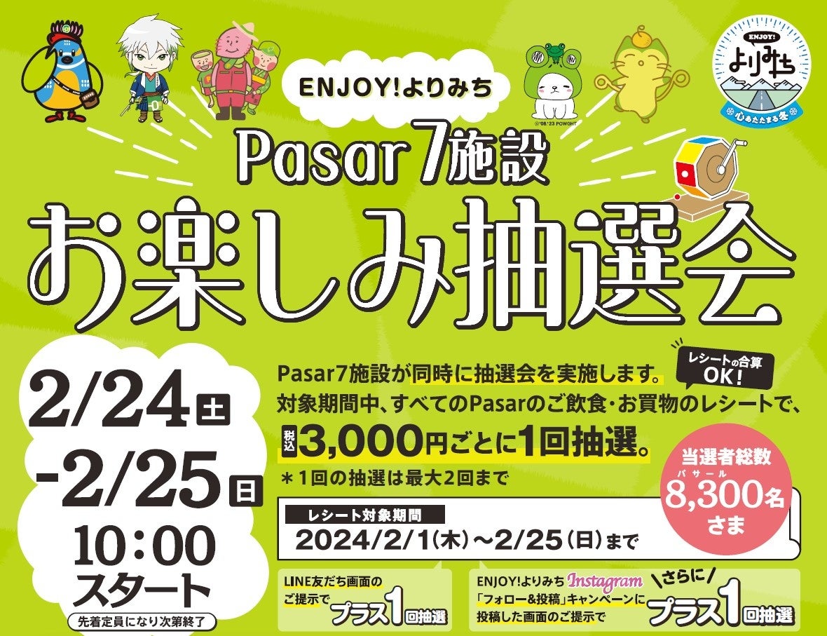 2月24・25日の2日間で、『ENJOY!よりみち Pasar7施設お楽しみ抽選会』の開催を予定しております。この機会にPasarに遊びに来てはいかがでしょうか。ご当選者様(総数8,300名様)には旅行ギフト券やPasarオリジナルキャラクターグッズが当たるチャンス!