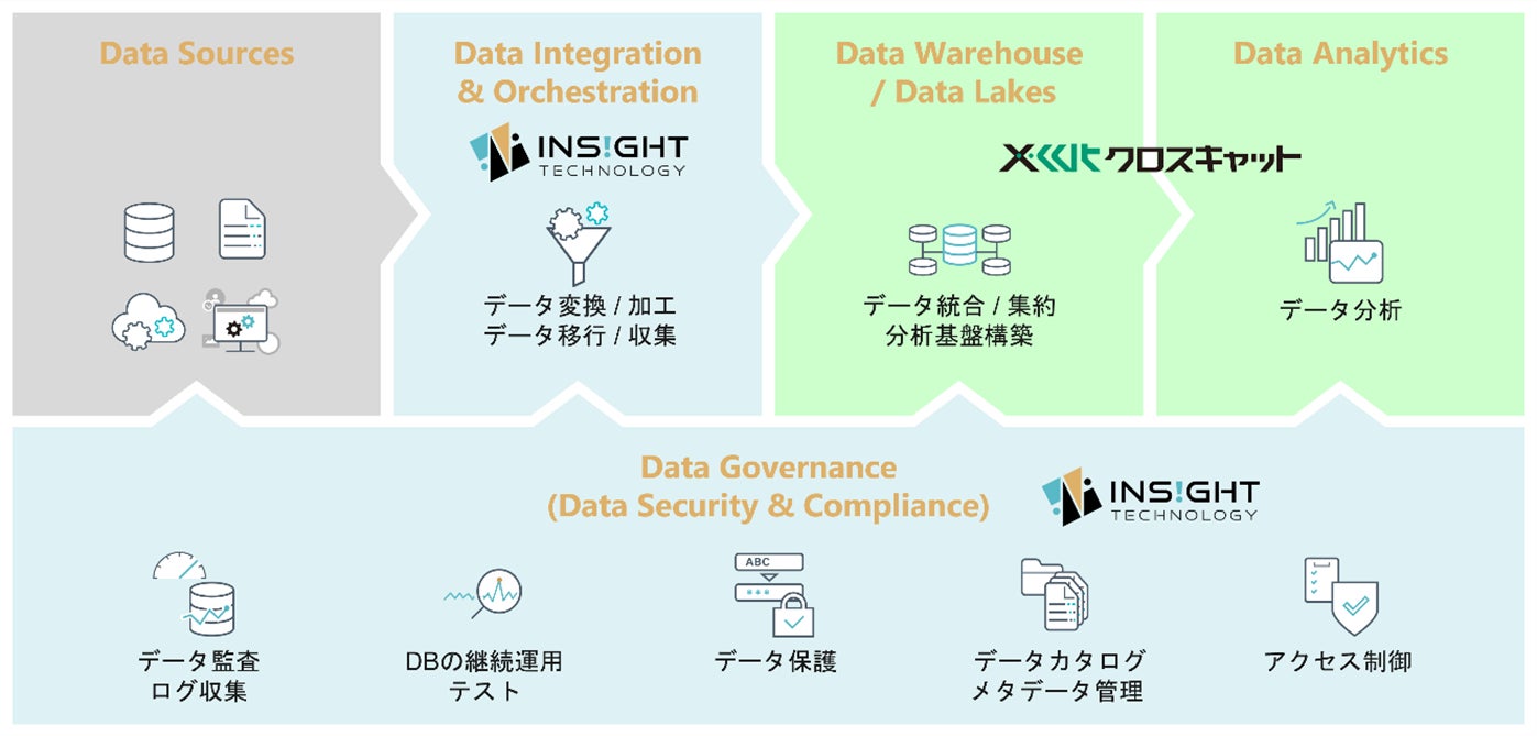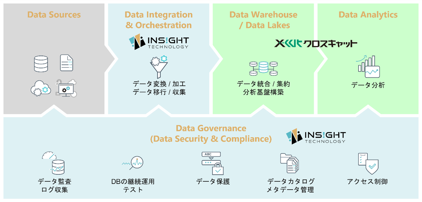 このソリューションは、データの収集や統合、加工、分析など、お客様のDX実現に向けてデータ活用基盤をワンストップで提供するものです。データベースに特化した豊富な経験や実績がある株式会社インサイトテクノロジーの「データインテグレーション」、「データガバナンス」ソリューションを通じてリアルタイムなデータアクセスを実現し、BIビジネスに強みを持つクロスキャットがデータ分析基盤を構築してまいります。