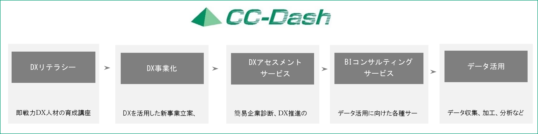 「CC-Dash」は、データ活用によってお客様のDX推進を支援する当社独自のフレームワークです。DXを推進する際の各フェーズ(①知る②つくる③集める④整える⑤分析する⑥活かす)における様々な課題に対し、テンプレート化と各種コンサルティングサービスをお客様に提供しています。加えてアライアンス等によってソリューションサービスのラインナップを随時追加・拡充していくことで、お客様のDX推進状況に合わせた支援策をワンストップで提供してまいります。
