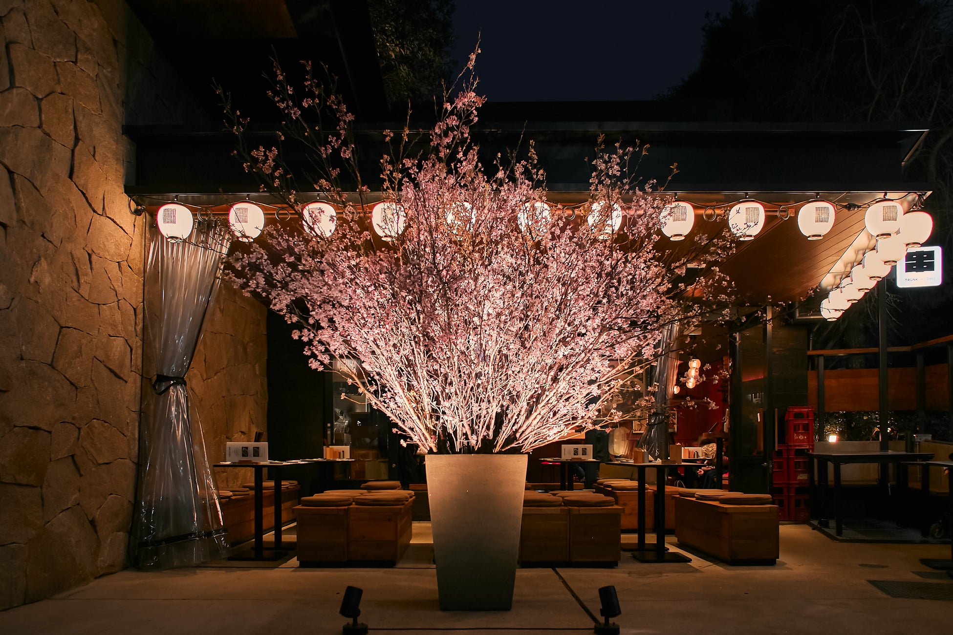 メインエントランスに隣接するTRUNK(KUSHI)前には、お花見気分が満喫できる毎年恒例の桜を設置しています。