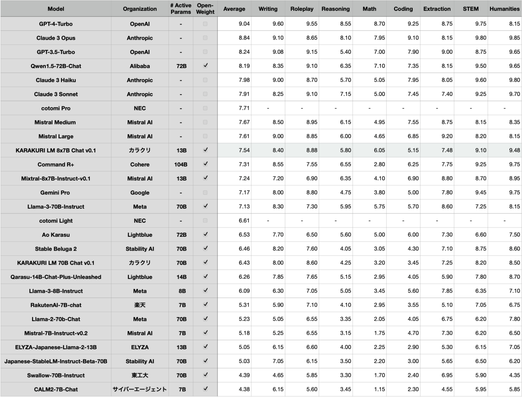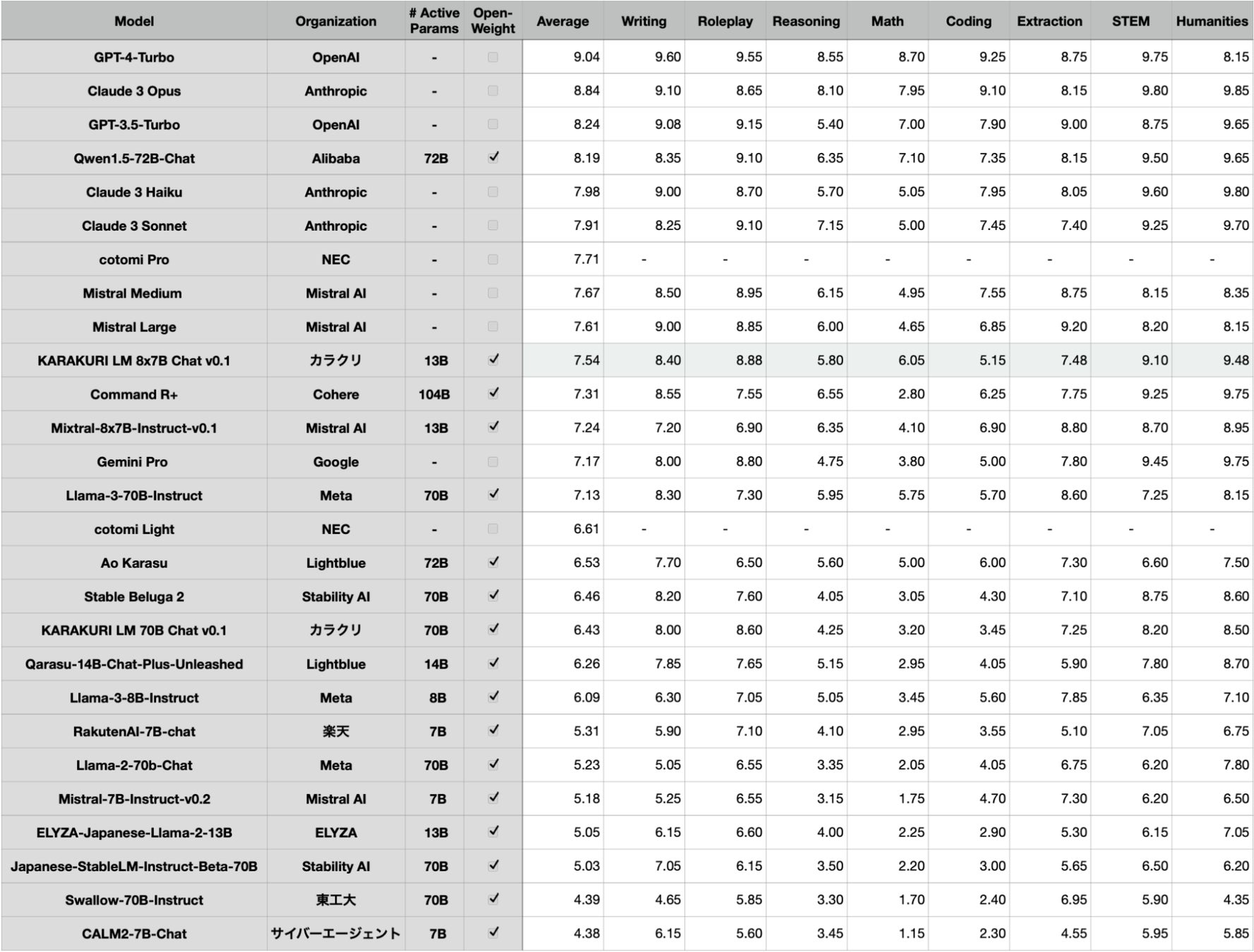 ※3 「Japanese MT-Bench」の性能評価で、国産オープンモデルとして最高点の評価を得ております(2024年5月7日時点)