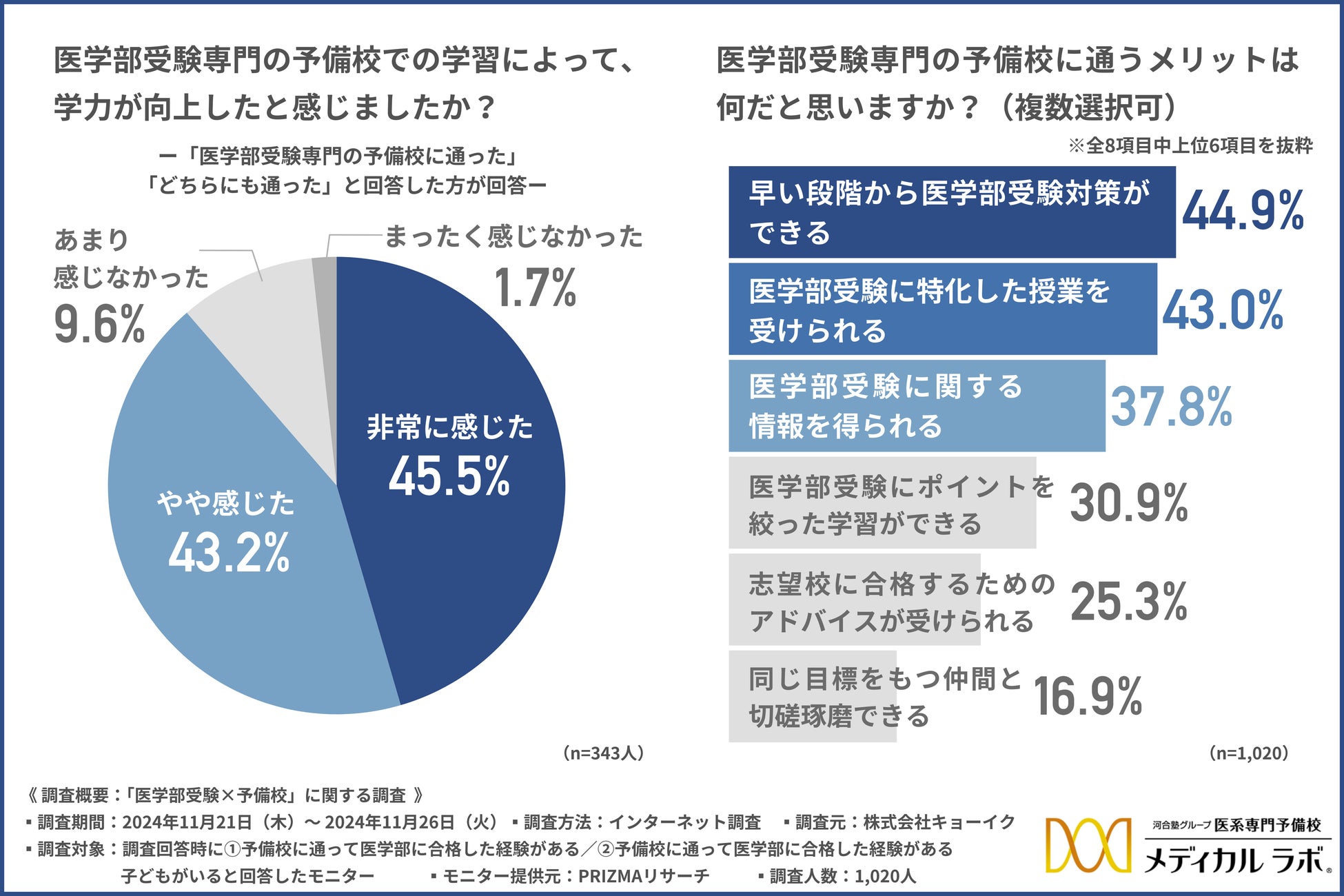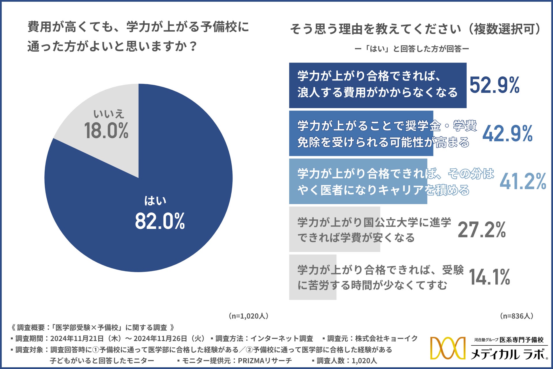そこで今回、医系専門予備校メディカルラボ(河合塾グループ)(https://www.medical-labo.com/)を運営する株式会社キョーイク(https://www.kyo-iku.co.jp/)は、①予備校に通って医学部に合格した経験がある方/②予備校に通って医学部に合格した経験がある子どもがいる方を対象に、「医学部受験×予備校」に関する調査を行いました。