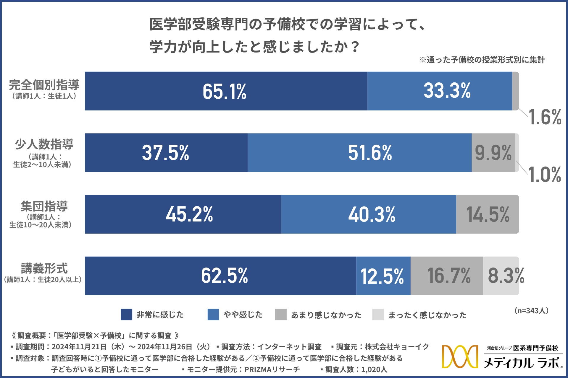 完全個別指導は学習効果が高いことが示されましたが、医学部受験専門の予備校の授業形式別ではどのような傾向が見られるのでしょうか。