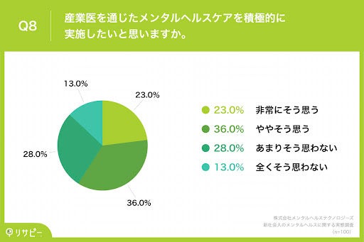「Q8.あなたは、産業医を通じたメンタルヘルスケアを積極的に実施したいと思いますか。」(n=100)と質問したところ、「非常にそう思う」が23.0%、「ややそう思う」が36.0%という回答となりました。
