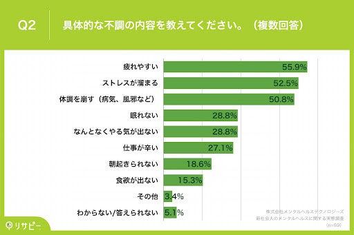 Q1で「とてもある」「ややある」と回答した方に、「Q2.具体的な不調の内容を教えてください。(複数回答)」(n=59)と質問したところ、「疲れやすい」が55.9%、「ストレスが溜まる」が52.5%、「体調を崩す(病気、風邪など)」が50.8%という回答となりました。