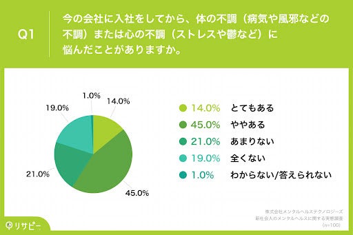 「Q1.今の会社に入社をしてから、体の不調(病気や風邪などの不調)または心の不調(ストレスや鬱など)に悩んだことがありますか。」(n=100)と質問したところ、「とてもある」が14.0%、「ややある」が45.0%という回答となりました。