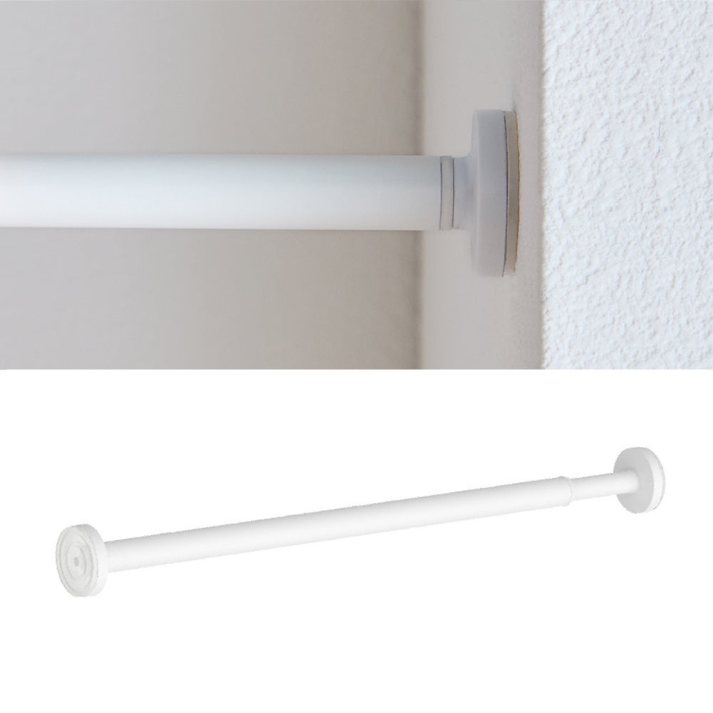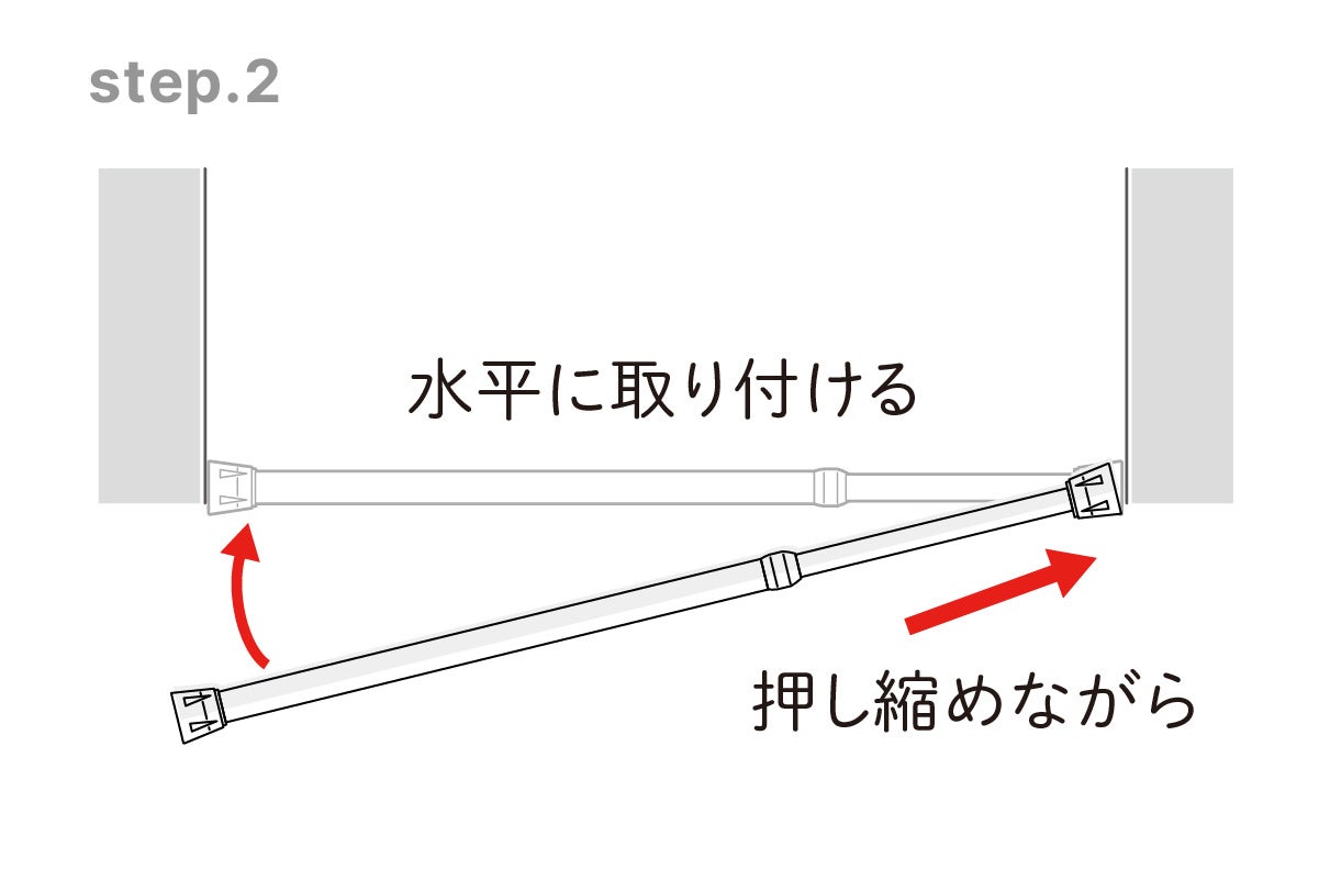 あらかじめ壁の幅より「数cm長く」伸ばしておき、バネを押し込みながら取り付ける。