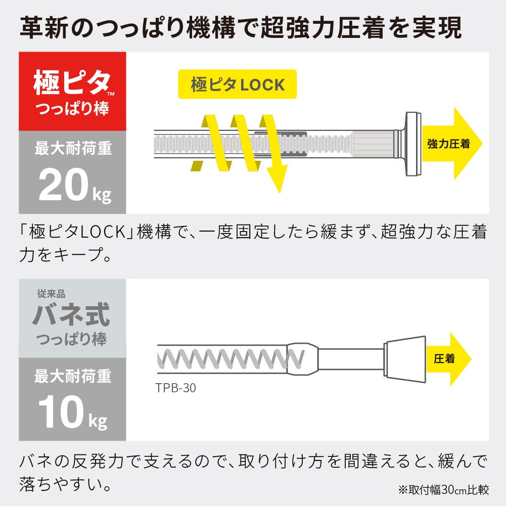 新機構「極ピタLOCK(*3)」により、パイプを回すだけで「長さの伸縮」と「壁への圧着」が同時に完了します。従来のバネ式で必要だった「パイプを縮めて押し込む」手順は不要です。複雑な手順は一切ありません。誰が取り付けても製品本来の圧着力を引き出せる、失敗知らずの設計です。